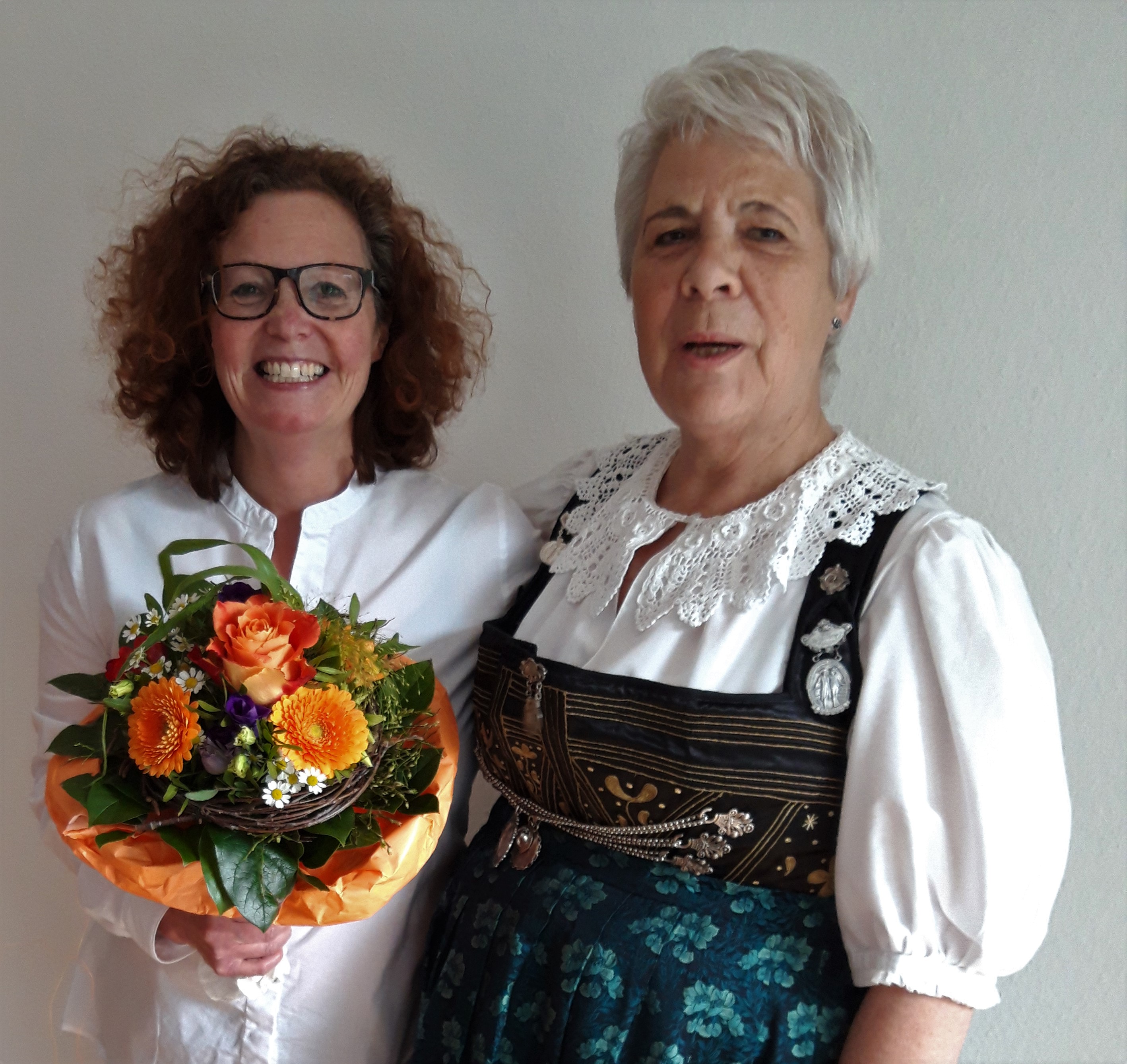 Herzlich empfing uns Birgit, die seit ihrer Kindheit dem Trachtenverein Friedberg angehört, wo die 1.Vorsitzende Monika Heinsch, ein Blumengebinde mit Präsent überreichte.